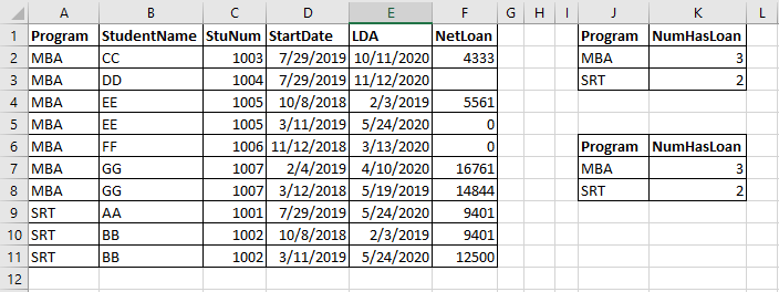 For example, an Excel Worksheet below, count unduplicated number of students have loans in the program. Note: NetLoan Column may have blank or 0 amount.